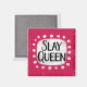 Uma design de tipografia engraçada e fofa que diz "Slay Queen". É um texto preto num retângulo branco com pontos brancos engraçados e lúcidos ao seu redor, todos num fundo magenta rosa quente.