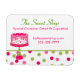 Magneta de cartão de visita de padaria branca feita em rosa, verde e branco. Gráficos doces de uma banda bolinhas, na parte inferior, e um bolo rosa divertido decoram este adorável ímã comercial. O texto rosa e verde é totalmente personalizável para atender às necessidades de sua empresa. Que maneira adorável de anunciar seu negócio.