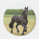 Cavalo frisesiano negro galopando em um campo.