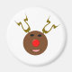 Este divertido ímã de Natal mostra um desenho engraçado de uma Reindeer. Ele tem olhos pretos e um nariz brilhante e vermelho brilhante. Os chifres estão apontando para cima e parecem fazeres futuristas que esta rena é uma ciberrena. Ele ainda é bonito e amigável.