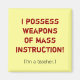 O professor diz, "Eu possuo armas de instrução em massa!" em letras vermelhas. (Sou professor.) de preto. Altere a cor do plano de fundo, bem como a fonte do texto e as cores do texto!