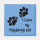 A pata imprime e texto em fundo azul. impressões à esquerda e à direita de gato de polidactilo (sete dedos). O texto abaixo diz "Eu amo meu gato poligálico"