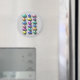 Formas tridimensionais em várias cores (azul, verde, rosa, laranja, amarelo, magenta, ameixa). 3 colunas por 6 linhas, círculo alternado e formas oblongas. É parecido com doces de duro ou hipérgicos.