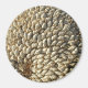 Girassol em foto próxima mostra a cabeça seca das sementes. As sementes não colhidas são acondicionadas de forma estritamente geométrica.