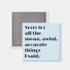 Adicione um toque de humor e estilo moderno a sua casa com este ímã engraçado com o texto 'Desculpe pelas coisas más, terríveis e precisas que eu disse' a negrito. O elegante design com um fundo pastel macio faz dele uma adição perfeita a qualquer cozinha ou escritório. Ideal para doação ou uso pessoal, esse ímã combina estética contemporânea com uma reviravolta lúdica, garantindo que ela se destaca em qualquer superfície.