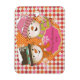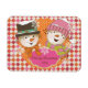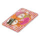O nosso ímã flexível Argyle Snowmen Holiday personalizou um casal de boné de neve em cima, chapéu de inverno, lenço listrado e nariz de cenoura em um fundo de padrão laranja, vermelho, rosa e branco de argila, pequenas bolinhas em laranja com flocos de neve de branco, e um banner rosa que você pode facilmente personalizar com um nome ou outro texto.