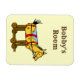 Um imã editável com letras ocidentais e arte safena de um cavalo de brinquedo com manchas castanhas sobre rodas, restaurado a partir de um livro de histórias infantil.