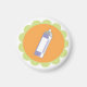 Íman branco com frasco de spray de cabelo sobre laranja e design verde.