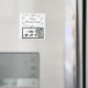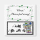 Lâmina de lavar louça que tem "Limpar! Por favor, saia daqui! Suja!" O lado limpo tem uma vinha ao seu redor, e o lado sujo tem uma borda ao seu redor e uma pilha de pratos sujos.