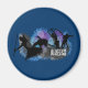 Magneta com silhuetas de atletas correndo, saltando e jogando sobre fundo gigante