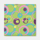 Um fundo verde brilhante é adornado com um padrão estranho de círculos, pontos e anéis numa variedade de cores vibrantes, incluindo rosa, azul, roxo e amarelo.