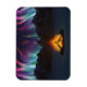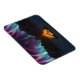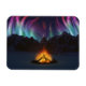 Em um vale coberto de neve em uma noite gelada no morto do inverno uma fogueira salta para cima para espelhar as luzes do norte enchendo o céu acima das montanhas distantes.