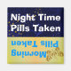 Um imã quadrado colorido feito como lembrete de medicação. O ímã é feito metade em azul escuro e metade em amarelo, com estrelas douradas e faíscas brancas no lado azul escuro e uma borboleta amarela ouro no lado oposto. O texto branco no lado azul diz Pílulas noturnas tomadas, e o sacudir e ele lê, Pílulas matinais tomadas, no lado amarelo do ímã. Torna muito mais fácil lembrar se você tomou seus remédios e um pequeno presente excelente para mais velho mais velhos que tendem a esquecer.