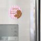 Um imã de Natal personalizável com um adorável homem de pão de gengibre com nariz e botões cor-de-rosa e glacé branco. Fundo listrado rosa e branco. Excelente estocante! Etiquetas de presentes coordenadas, cartões de nota, selos postais, papelaria e canecas também disponíveis! PinkInkArt original!