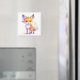 Um ímã quadrado muito bonito com uma ilustração de uma raposa bebê sorridente.