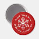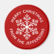 Um floco de neve branco sobre fundo vermelho com "Feliz Natal" da família ao seu redor.