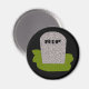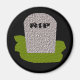 Este ímã apresenta uma tombstone de cinza com RIP em texto gotejando sobre ele, em pé sobre um pedaço de grama verde. Ao lado dessa design mórbida, o fundo é preto.