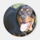 Um cão rotweiler amistoso deitado no gramado com a língua a sair.