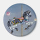 Ilustração colorida e desenhada à mão de um belo cavalo carrossel contra um pano de fundo azul macio de estrelas, cometas, planetas no espaço sideral, esta obra de arte original satisfará qualquer colecionador ávido de carrossel e é perfeita para presentes, roupa e decoração infantis. Sua compra pode ser tornada ainda mais exclusiva personalizando com nomes ou declarações favoritas.