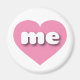 Este ímã apresenta um coração cor-de-rosa vibrante contendo as letras maiúsculas, brancas e em negrito, arredondadas, uma abreviação lúdica para Maine, o estado do pinheiro.