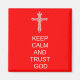 Inspirada pelo poster da Segunda Guerra Mundial Britânica, "Mantenha Calma e carregar", esta design apresenta uma cruz branca e o texto, "Mantenha Calma e Confie em Deus."