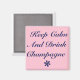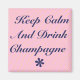 Fique calmo e beba champanhe! Inscrição azul sobre fundo cor-de-rosa com bolhas amarelas.