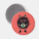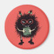 Magneta amante de livros com uma ilustração vetorial engraçada de uma criatura peluda mau com rabos de cavalo e óculos segurando um livro e sorrindo com seus dentes afiados.