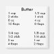A manteiga é excelente, mas às vezes não é possível usar apenas um pau em uma receita. Às vezes temos um bastão parcialmente usado ou fazemos meio lote de algo, ou talvez você tenha comprado 1 quilo de blocos, ou talvez você tenha uma banheira. Ser capaz de medir a manteiga de diferentes maneiras pode torná-la um pouco mais fácil. Eu incluí onças, copos, colheres de sopa, e como eles se relacionam com paus de manteiga. Sendo este um ímã de geladeira, você pode agora ter as informações de que precisa à mão sempre que precisar.