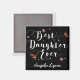 Linda caligrafia moderna em branco com palavras, "Melhor Filha Nunca." O design centra-se em sotaques florais e verdes coloridos sobre fundo preto. Espaço reservado para o nome personalizado da sua filha no centro inferior do design.