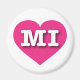 Este ímã apresenta um coração vibrante, rosa-quente contendo as letras maiúsculas, brancas, em negrito MI, a abreviação oficial de Michigan, estado dos Excelentes Lagos.