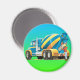 Um crachá de betão listrado azul e amarelo, um grande caminhão de construção.