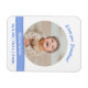 Trendy, classy personalized new baby boy flexible photo magnet to use in lieu of a birth announcement on paper for Grandma. It includes a white frame with a round opening for a custom horizontal photo, the baby’s birth stats, and a curved blue band on which appears the first and middle names (or first and last names) of the little one in an elegant script font / typography. This design includes the words "I love you, Grandma!", which you can further personalize.