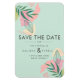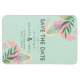 Um casamento colorido e moderno salve a data perfeita para o seu casamento de verão. Apresentando folhas tropicais e abstrato em cor-de-rosa, limão e verde-lacrimogêneo e coral, num fundo verde-hortelã neo, com seus detalhes personalizados em cinzas escuras.