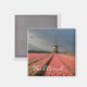 Fotografia de Souvenir de uma paisagem com moinho de vento e flores de tulipa cor-de-rosa em filas numa fazenda de bolbo sob um céu de cinza no campo dos Países Baixos em primavera com o texto "Holanda".