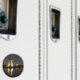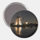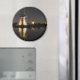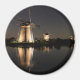 Fotografia circular de souvenir de uma paisagem com várias moinhos de vento, iluminada à noite, com reflexo na água do canal, ainda em Kinderdijk, Países Baixos.