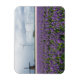 Magneta de Souvenir com paisagem com moinho de vento tradicional e várias moinhos de vento modernos para gerar energia verde atrás de um campo com flor de hyacinto roxa na Região Bulb, na Holanda.