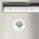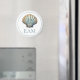 Este belo ímã redondo monograma apresenta uma concha costeira de couro cabeludo em tons de aquarela macia de blues e latas. Personalize o monograma com sua escolha de iniciais. Divertido para sacos de presentes e favoritos para festas personalizados.