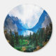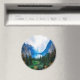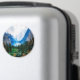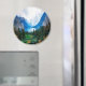 Um ímã com uma bela fotografia de uma cena agradável e tranquila da natureza. Floresta verde vibrante na frente e montanhas azuis sombrias nas costas. Com um céu branco nublado e sonhador. Mistura e mágica.