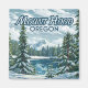 A neve se instala em uma paisagem do inverno de pinheiros e um lago abaixo do cume do Monte Hood, Oregon. Monte Hood, Oregon, um estratovulcão proeminente e o pico mais alto do estado, foi nomeado em 1792 pelo explorador britânico William Broughton. Entre os pontos principais estão Timberline Lodge, uma estância histórica de esqui que oferece esqui durante todo o ano, e o Lago Trillium, conhecido pelas suas reflexões impressionantes da montanha. A região acolhe também o Monte Hood Climb anual, honrando a história da montanha da região e atraindo entusiastas ao ar livre para caminhar, esquiar e exploração cênica.