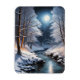 Uma bela lua de cheio sentada sobre um riacho no inverno enquanto a neve cai suavemente.