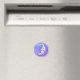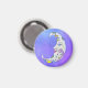 Este ímã tem uma lua branca crescente mística, decorada com várias formas coloridas em azul e amarelo, e um roxo roxo com rosto sobre fundo do céu roxo com estrelas pontilhadas.