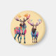 A vivid, colorful moose stands proudly, adorned with abstract patterns and vibrant hues. The antlers fade from orange to pink, while the torso features floral and geometric shapes in blues, reds, and purples.