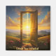 Uma chave radiante brilhando em matizes vibrantes de ouro, abrindo uma porta para um horizonte iluminado pelo sol com campos verdes e um céu limpo.