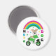 Um cachorro giro numa moto rodeado por um arco-íris e estrelas coloridas, design para crianças