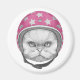 Este design apresenta um retrato de um gato persa com um capacete de motociclista rosa.