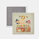 Magnet com uma ilustração de Ação de Graças - um peregrino e nativo com muitos desenhos de Ação de Graças. Uma mesa com um glorioso banquete de peru, folhas de outono e uma coroa. O texto diz muitos Obrigados. Colocado sobre um fundo bronzeado com uma cor damasco.