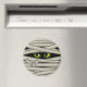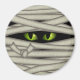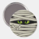 Uma múmia arrepiante e embrulhada com olhos verdes brilhantes e bandagens clássicas de gaze decoram esta imã de geladeira redonda. Também disponível em uma paleta de cor laranja. Procure ID685 para ver os suprimentos e acessórios da parte coordenadora com este padrão múmico do excelente.