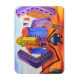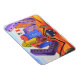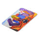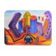 Uma pintura colorida, divertida e imaginativa representando alguém em um carro deixando uma cidade com prédios tortos.