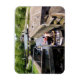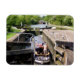 Uma design fotográfica de um barco estreito de canal que acabou de entrar na fechadura e esperar que os portões fechem.
