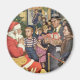 Ilustração Vintage design de Natal com uma família visitando Papai Noel com uma multidão no shopping de compro. A criança está sentada no colo dos Papais noeis e prestes a sussurrar sua lista secreta de desejos de Natal para o Santo Jolly Nicholas. O pai está segurando presentes enrolados e há um saco de brinquedos ao lado de Papais noeis para dar a crianças como presentes. Ho, Ho, Ho!
